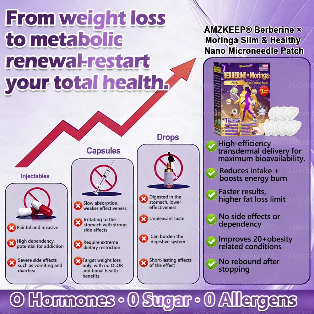 โ ย Easy Absorption:ย This formula uses an advanced nano microneedle patch delivery system. Combined with highly active ingredients such as berberine, it delivers key nutrients transdermally into the body, bypassing the digestive system and reducing gastrointestinal burden. The patch provides gentle, steady release for a more comfortable experience, making it especially suitable for individuals with sensitive digestion and those who prefer to avoid injectable weight-loss methods.