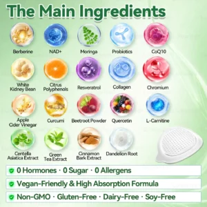 Apple cider vinegar powder, white kidney bean extract work synergistically on carbohydrate metabolism and gut motility by reducing digestive enzyme activity and supporting hepatic and biliary detoxification and bile flowโpromoting fat digestion, nutrient absorption, and endotoxin clearance to maintain a more balanced intestinal environment. Moringa, green tea extract, rich in natural polyphenols, help inhibit pathogenic bacteria, support the expansion of beneficial probiotics, and enhance microbiome diversity, improving bloating, irregular bowel movements, and overall digestive discomfort.