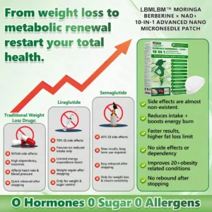 Purelora® 10-in-1 Nano Microneedle Patch is the result of over 20 years of research and development by more than 30 experts. It was specially formulated for middle-aged, older, and overweight individuals. This product utilizes nanoscale microneedling technology to ensure that the active ingredients effectively and painlessly penetrate to the cellular level. Its advanced formula contains highly concentrated natural active ingredients such as berberine and moringa, which work synergistically to support blood sugar stabilization, appetite regulation, and fat metabolism—thus enabling a gradual and sustainable weight management process. NAD+ and collagen peptides help maintain skin firmness and elasticity during weight loss, so you not only look good but also feel great while slimming down. Other natural ingredients support immune function, digestion, gut balance, women’s health, daily energy levels, and fatigue—helping you regain youthful vitality from within. This product is manufactured in a GMP-certified facility that meets US and quality standards, thus offering a convenient, painless and scientifically sound solution for safe and comprehensive weight management and long-term health.