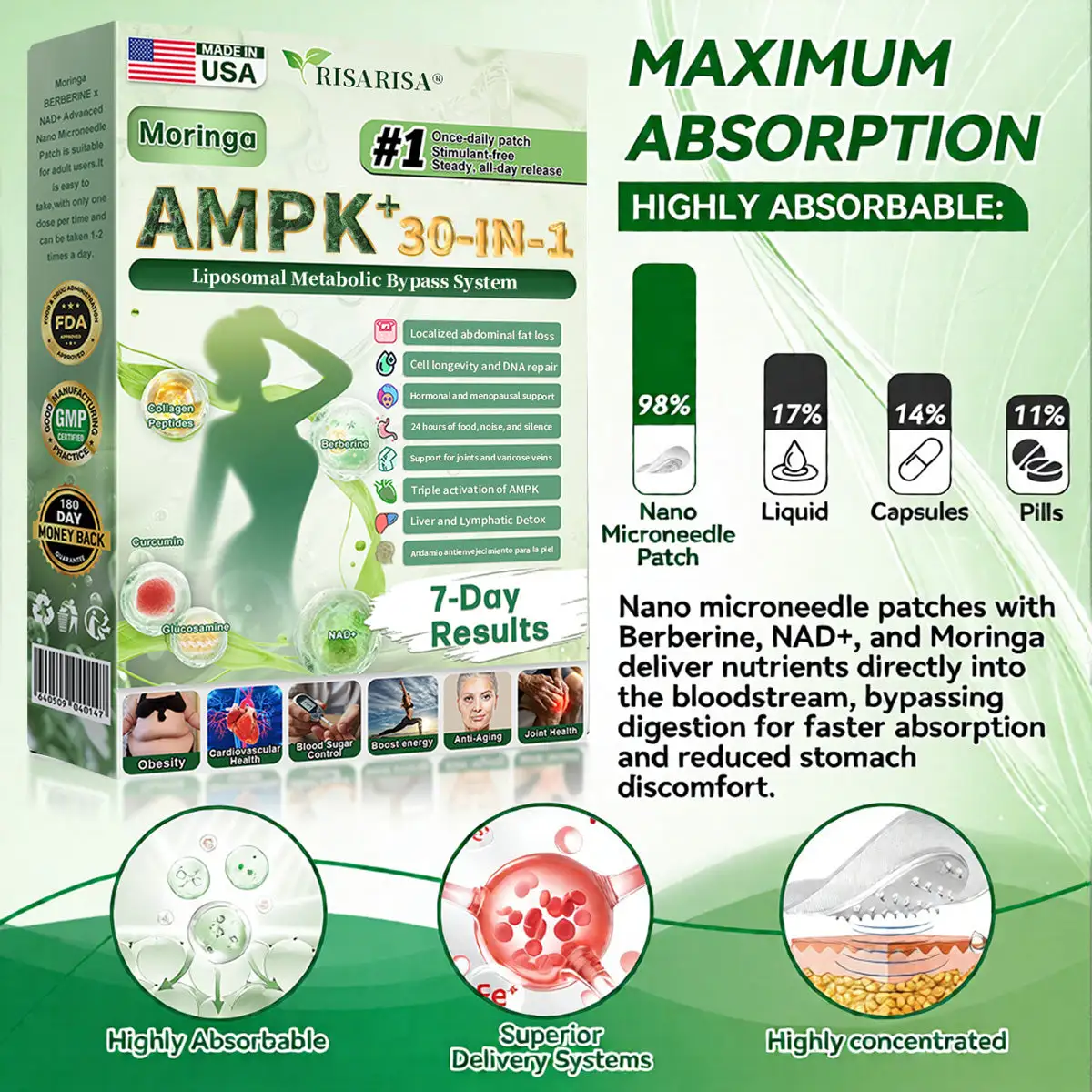 ๐๐ข๐ฌ๐๐ซ๐ข๐ฌ๐ยฎ ๐๐-๐๐ง-๐ ๐๐๐ซ๐๐๐ซ๐ข๐ง๐ ยท ๐๐๐+/๐๐๐ ร ๐๐๐ญ๐ซ๐ข๐ฑ๐ฒ๐ฅ ๐๐๐๐ ๐๐๐ฏ๐๐ง๐๐๐ ๐๐ข๐ฉ๐จ๐ฌ๐จ๐ฆ๐๐ฅ ๐๐tchย was developed through more than 20 years of research by a multidisciplinary team of over 30 experts. Each patch incorporates an ultra-fine microneedle architecture measuring approximately one-seventh the thickness of a human hair. designed to ensure a smooth and virtually painless application. The formulation contains highly concentrated natural bioactive compounds. up to 20-fold higher than conventional market levels. including Moringa and Berberine. which act synergistically to support healthy glycemic responses. appetite regulation. and lipid metabolism. thereby promoting gradual and sustainable weight management. Enriched with NAD+. the patch further supports skin firmness and structural resilience during body-weight fluctuations. helping maintain a lean appearance without compromising comfort or aesthetics. Additional high-efficacy components contribute to the support of immune function. digestive health. gut balance. women’s health. daily energy levels. and fatigue reduction. collectively promoting a more youthful and resilient physiological state from within. Manufactured inย facilities that comply with both U.S. and EU quality standards. this needle-free. science-driven solution provides a safe and comprehensive approach to effective weight management and long-term metabolic health. designed to work in harmony with the body rather than against it.