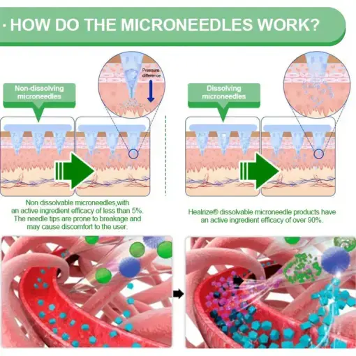 Our nano microneedle patch is dermatologically tested and precisely engineered to control the transdermal release of active ingredients. While the skin naturally acts as a strong barrier, this advanced nano microneedle system is specifically designed to penetrate that barrier safely and effectively. Each microneedle is just 0.27 mm in length—about one-seventh the thickness of a human hair—and made from dissolvable bioactive materials, ensuring a smooth, virtually painless application while delivering ingredients directly into the skin.