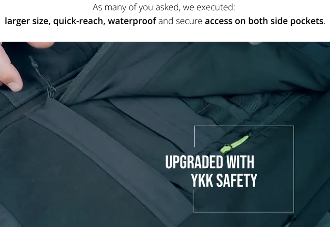 Invisible YKK zippers on each side for extra storage and security