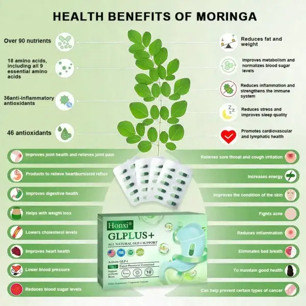 Moringa combined with Honxi® Glplus+ All Natural Glp-1 Support offers a powerful blend of natural health benefits. Rich in over 90 nutrients, 18 amino acids (including all 9 essential ones), and 46 antioxidants—36 of which have anti-inflammatory properties—Moringa supports metabolism, immunity, and weight control.