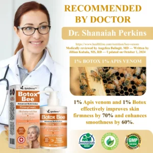 According to Dr. Shanaiah Perkins, a renowned dermatologist at the Dermacare Institute as of August 16, 2024, the ApisDerm™ BotoxBee Advanced Multi-Action FirmingCream containing 1% Apis venom and 1% Botox effectively combines the skin-tightening and smoothing effects of Apis venom which stimulates collagen production to enhance skin elasticity and firmness with Botox’s ability to temporarily relax targeted muscles reducing wrinkles and providing a more youthful appearance.