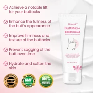 Introducing the Biancat™ ButtMax+ Bee Venom Butt Enhancer Cream, a state-of-the-art solution designed to transform your buttocks into a youthful masterpiece. This all-natural cream boosts skin elasticity, targeting hip fat and sagging for a tighter, firmer lift. Perfect for those with flat butts or seeking enhancement, it’s a safe and effective way to enhance appearance. Infused with bee venom, known for its skin-firming power, it nourishes and strengthens skin, promoting a sculpted look by stimulating collagen and elastin. Deeply penetrating, it repairs buttock cells and boosts fat cell activity, increasing volume and firmness.