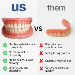 Most online dentures may look appealing with a lower price tag—but they miss the one thing that matters most: fit. A rigid, non-adjustable denture is like wearing the wrong size shoes—unbearable, no matter how nice they look.