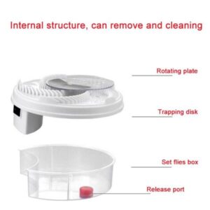 How to Use: Spread the liquid bait on the 5 grooves. Connect the power and turn on the switch. The fly is attracted by the liquid bait and transferred into the box by the rotating plate. Remove the fly trap box and clean (Fill with water to drown the flies first).