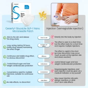 Ceoerty® innovatively uses the GlucaLite GLP-1 Nano Microneedle Patch, completely revolutionizing traditional injection therapies and offering a more convenient and safer blood sugar management experience. Each microneedle is only 0.27mm, about 1/7th the thickness of a hair, made of soluble drugs. When applied to the skin, it painlessly penetrates the stratum corneum, precisely releasing the drug’s components, providing 24-hour sustained effects, comparable to intravenous infusion in terms of stability. Non-invasive, painless, and requiring no professional skills, it allows you to easily manage blood sugar and weight loss at home.