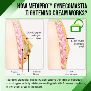 MediPRO™ Gynecomastia Tightening Cream targets glandular tissue by decreasing the ratio of estrogen to androgen activity. It also warms up the fatty tissues under your skin to facilitate a more effective reduction of gynecomastia while preventing fat cells from building up in your chest area in the future!