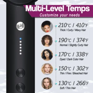 It supplies 5 adjustable, accurate heating temperatures that are suitable and completely safe for all hair types. You can easily switch it up from 130°C up to a maximum of 200°C just by pressing the higher or lower temperature button. It can beautifully straighten soft thin hair, wavy hair, curly hair, and even those with thickened kinky locks.