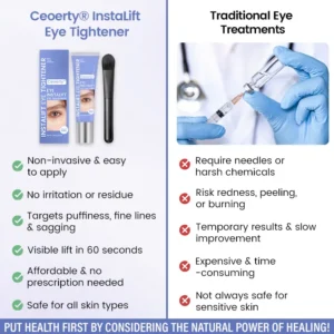 “Ceoerty® InstaLift Eye Tightener has been widely recognized by dermatologists and skincare specialists as a breakthrough in instant eye rejuvenation. Its advanced peptide-infused tightening technology is designed to penetrate the delicate under-eye area, delivering rapid, root-level lifting and smoothing. Clinical studies have consistently shown that InstaLift’s triple-action formula significantly reduces puffiness, smooths fine lines and wrinkles, and brightens dark circles within just seconds of application. Unlike conventional eye creams that take weeks to show minimal results, InstaLift works instantly — without leaving residue, causing irritation, or relying on harsh chemicals. This innovation sets a new standard in at-home eye care, delivering professional-grade results in a gentle, easy-to-use formula.”