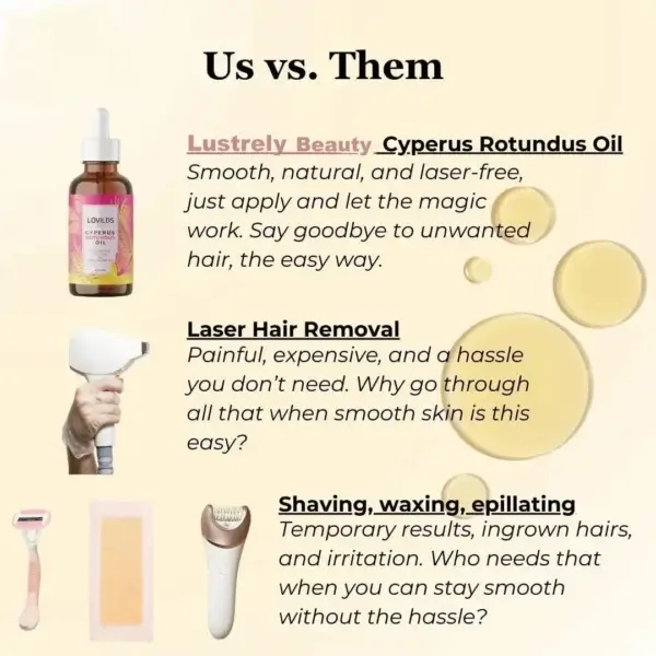 Say goodbye to unwanted body hair with our Cyperus Rotundus Oil. This powerful ingredient, along with jojoba oil and rosehip oil, helps to gradually reduce hair growth, leaving you with soft, smooth skin. Tea tree oil further enhances the formula with its soothing properties, offering a natural, effective alternative to hair remover sprays and creams.