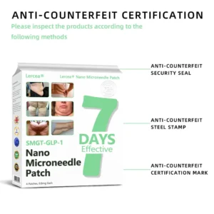 The Nano Microneedle Patch contains SMGT-GLP-1 in each patch. It works by mimicking the action of Glucagon-like Peptide-1 (GLP-1), promoting insulin secretion, inhibiting glucagon secretion, and delaying gastric emptying, which helps control blood sugar levels and aids in weight loss.