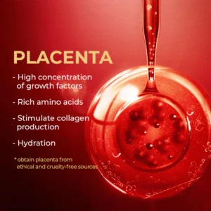 Plant placenta is a rich source of proteins, amino acids, and peptides, which all play an important part in activating the skin’s collagen production and boosting cellular metabolism. When used in skincare, this ingredient delivers nourishment, antioxidant protection, and anti-inflammatory benefits that help in skin repair.
