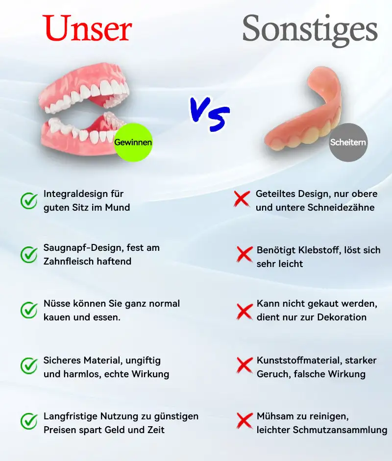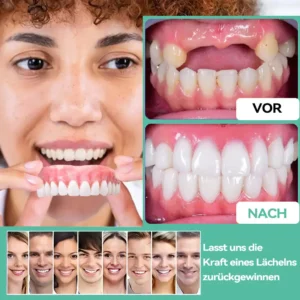 “Ich habe jahrzehntelang geraucht und mit der Zeit hat das meinen Zähnen geschadet. Ich habe mehrere verloren und die Karies hat das Essen und sogar das Lächeln schmerzhaft gemacht. Regelmäßige Zahnarztbesuche waren einfach zu teuer, also habe ich mir dieses Zahnersatzset zugelegt. Es ist ein wahrer Segen! Es sitzt bequem und ich kann endlich ohne Schmerzen essen. Außerdem ist es im Vergleich zu einer Zahnbehandlung erschwinglich. Ich wünschte, ich hätte das früher gemacht – es hat meine Lebensqualität wirklich verbessert.” – Maximilian Müller