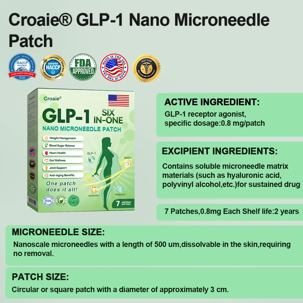 Croaie® SIX IN-ONE Tirzepatide Nano-Microneedle Patch was carefully developed by the Obesity Association. This cutting-edge product was designed by a team of leading experts in obesity management. who have conducted years of in-depth research to fully understand the mechanisms of weight loss and obesity control. Its unique formula is designed to effectively promote weight loss. maintain blood sugar stability and enhance metabolic balance. while incorporating Matrixyl 3000 to provide a significant lifting and firming effect. helping users to more comprehensively improve their body shape and skin condition. thereby supporting them in achieving their health goals.