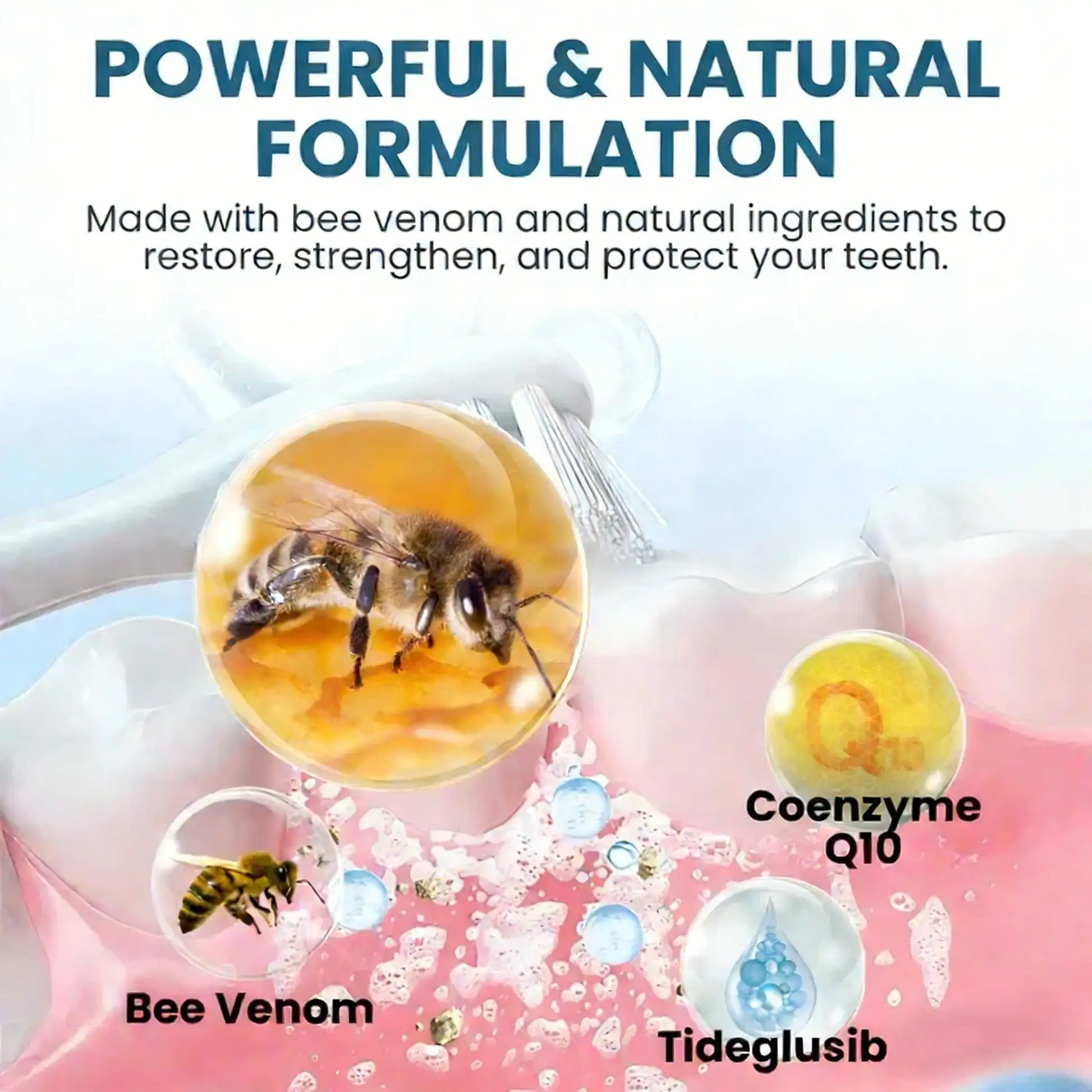 The primary active ingredient, bee venom peptide melittin, works as a powerful anti-inflammatory agent that penetrates deep below the gum line where other treatments can’t reach. When combined with our proprietary blend of regenerative compounds, it creates a synergistic effect that activates your body’s natural healing mechanisms.