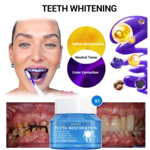 Achieve noticeable whitening results in just one week with 𝐃𝐎𝐂𝐓𝐈𝐀™ Dental Restoration Mineral Powder. Purple is the complementary color to yellow on the color wheel, so applying water-soluble purple dye to your teeth neutralizes any yellow undertones. Additionally, its vitamin C-rich formula removes plaque, tartar, and discoloration, restoring teeth to their natural whiteness.