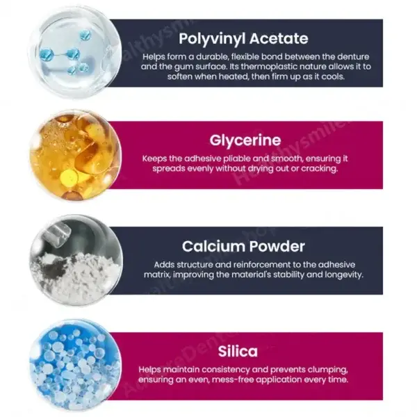 Silica gives the adhesive a soft, moldable texture during application, allowing it to adapt effortlessly to your gum contours. It helps maintain consistency and prevents clumping, ensuring an even, mess-free application every time.