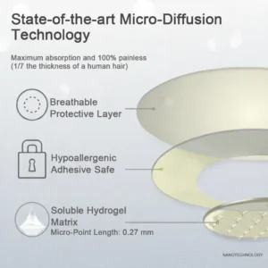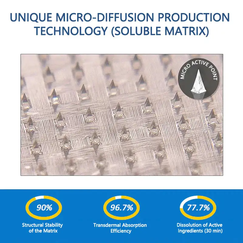 Precision-Engineered for Comfort and Efficacy “Each micro-point measures just 0.27 mm in length—merely 1/7th the thickness of a human hair—and is crafted from soluble active hydrogel. These points are precision-manufactured using state-of-the-art techniques to guarantee a 100% painless experience, while effectively delivering potent botanical ingredients directly into the skin for maximum absorption.”