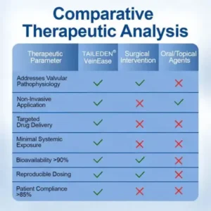 TAILEDEN® VeinEase represents the first commercially available transdermal phytotherapy system specifically designed to address venous valvular insufficiency through localized botanical intervention. Unlike systemic treatments that dilute active compounds throughout the circulatory system or topical applications that cannot penetrate the dermal barrier, our microneedle delivery system ensures concentrated therapeutic compounds reach the target tissue with minimal systemic exposure.