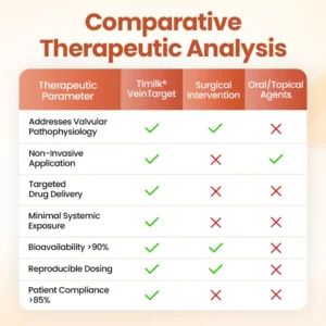 Timilk® VeinTarget represents the first commercially available transdermal phytotherapy system specifically designed to address venous valvular insufficiency through localized botanical intervention. Unlike systemic treatments that dilute active compounds throughout the circulatory system or topical applications that cannot penetrate the dermal barrier, our microneedle delivery system ensures concentrated therapeutic compounds reach the target tissue with minimal systemic exposure.